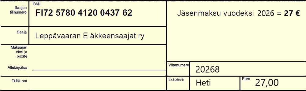 Maksetaan yhdistyksen tilille FI72 5780 4120 0437 62 viite 20268