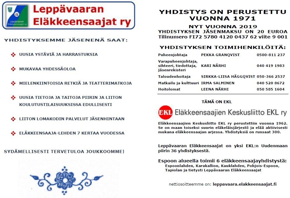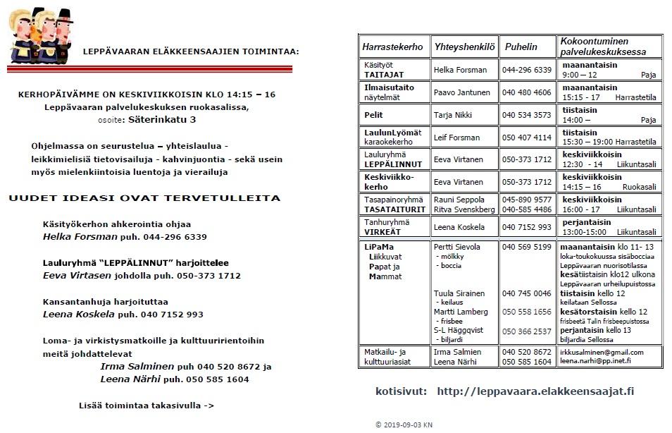 13.12. Lepolammella joulujuhla / 11.12. puurojuhla / 9.10. Aleksis Kiveä mukaillen "Setsemän sisarta" / 5.8. Visby / 24-29.6. Ryhmäloma Rajaniemen lomakeskuksessa, mukana video Evakon laulu / 15.5. kevätkauden viimeinen keskiviikkokerho / 22-28.4. Pühajärvi, Otepää / 16.1. Sellosalin lämpiössä järjestöjen esittely / 16.1. muistaminen