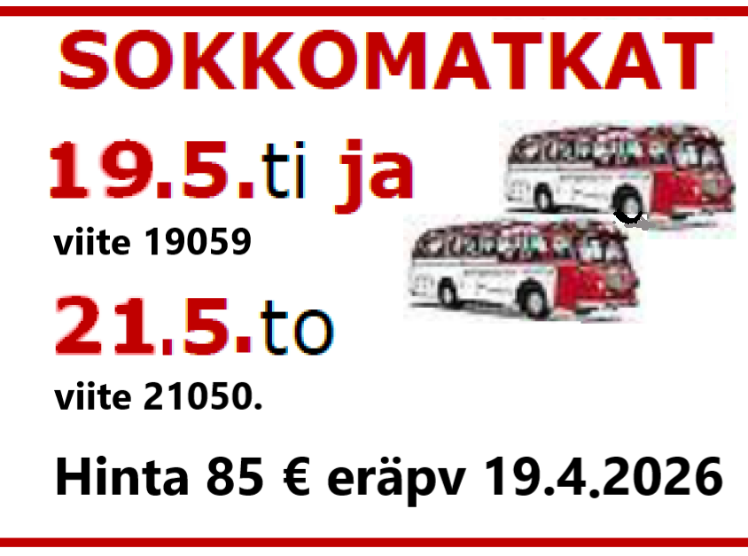 Sokkomatkat perinteiseen tapaan ennalta arvaamatonta reittiä hyvässä reurassa. Hinta 85 € eräpv 19.4,2026 Sokkomatka 1 tiistaina 19.5 viite 19059 ja Sokkomatka 2 torstaina 21.5 viite 21050. Lähtö…