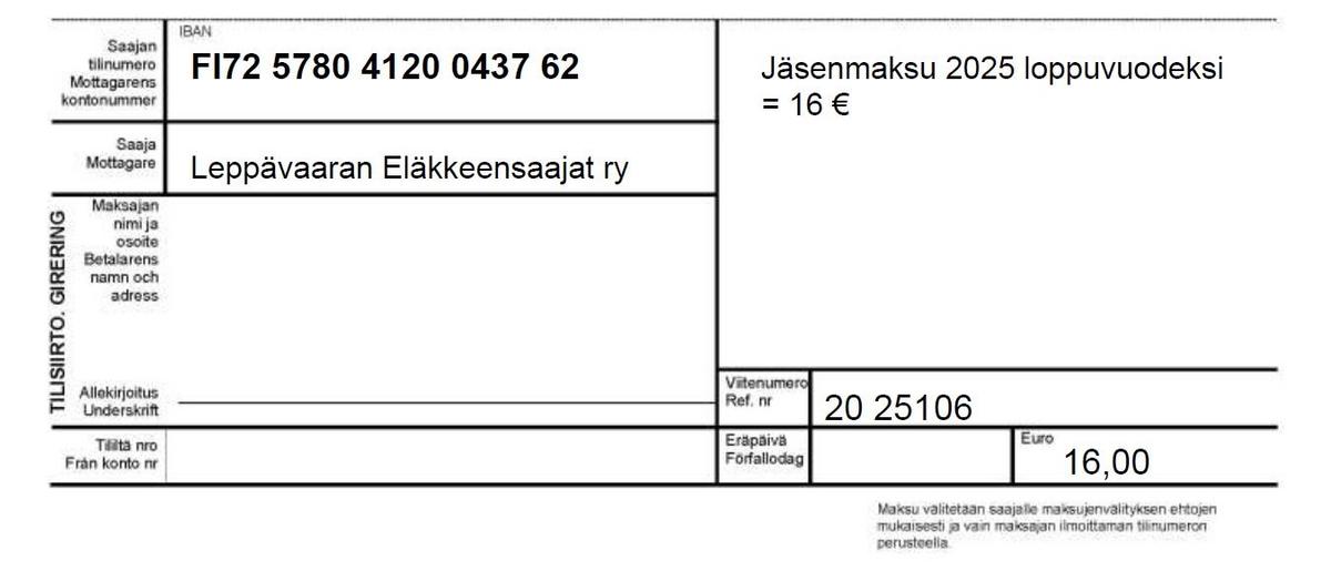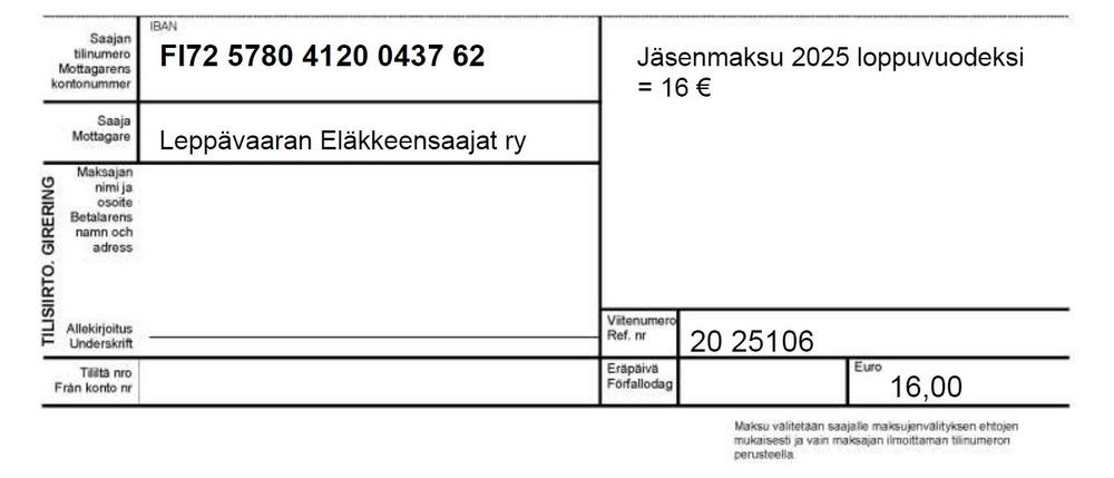 Vuoden 2026 jäsenmaksun on 27 € ja viitenumero 20268